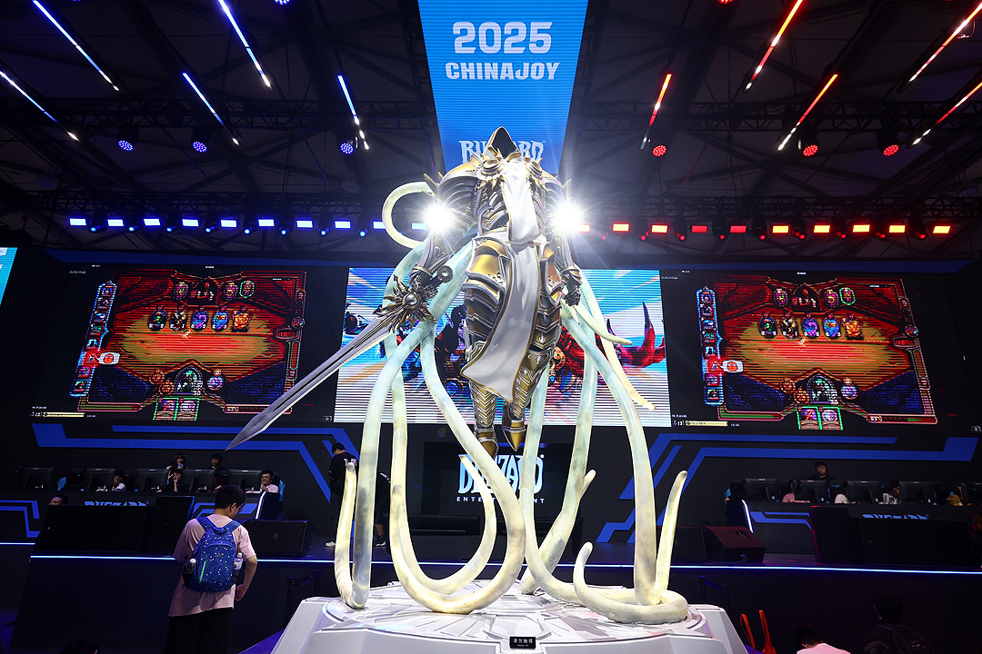 图为暴雪游戏展台,泰瑞尔巨型雕像降临现场。暴雪游戏本次展台带来《魔兽世界》、《炉石传说》、《守望先锋》、《暗黑破坏神》四款经典IP。