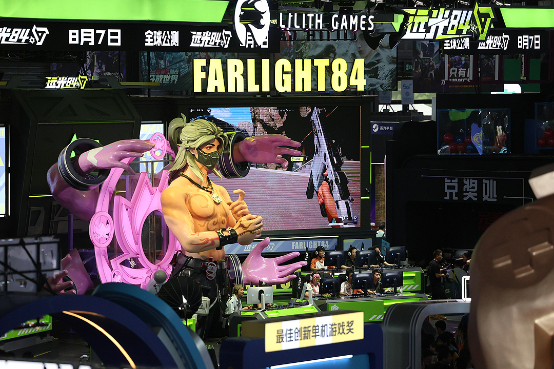 图为莉莉丝制作的国产英雄射击旗舰之作《远光84》参展本届ChinaJoy。巨型“魁斗法天象地”模型以及丰富的互动体验区,成为CJ现场最吸睛的焦点之一。
