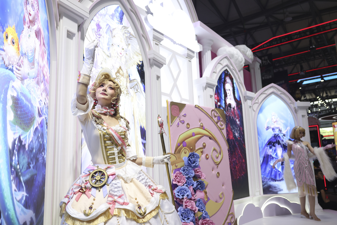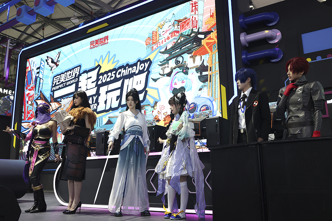 图为完美世界展台,众多Coser参与观众互动。