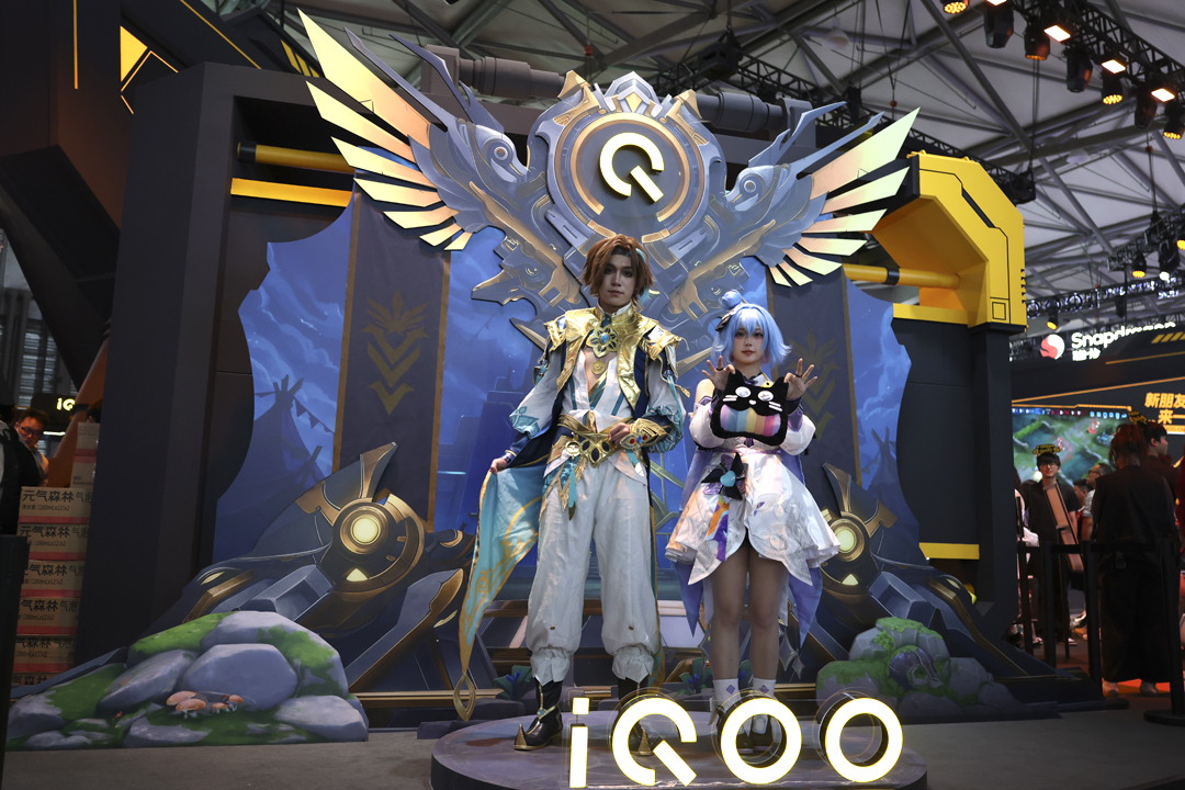 图为vivo子品牌iQOO展台上Coser摆出造型吸引游戏玩家。
