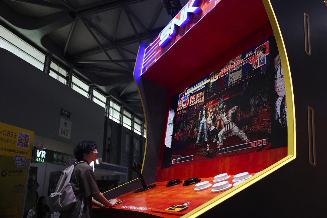 图为上海ChinaJoy SNK展台巨型街机前,一名爱好者正在操作游戏手柄试玩街霸游戏《饿狼传说》。本次展览SNK展台将见证《拳皇15》《饿狼传说》巅峰对决,试玩街霸角色“肯”,巨型街机+摇滚乐队引爆玩家格斗狂欢。